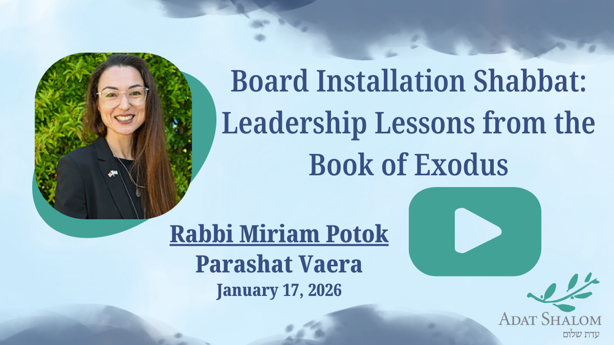 Adat Shalom’s Shabbat morning services are musical and traditional, structured and improvisational, full of joy and depth. Rabbi Miriam Potok and Cantor Dale Schatz co-lead our services, bringing a rabbi-cantor banter that delights members and guests alike. We use the full liturgy of the Masorti/Conservative movement, and we daven from the Siddur Lev Shalem.